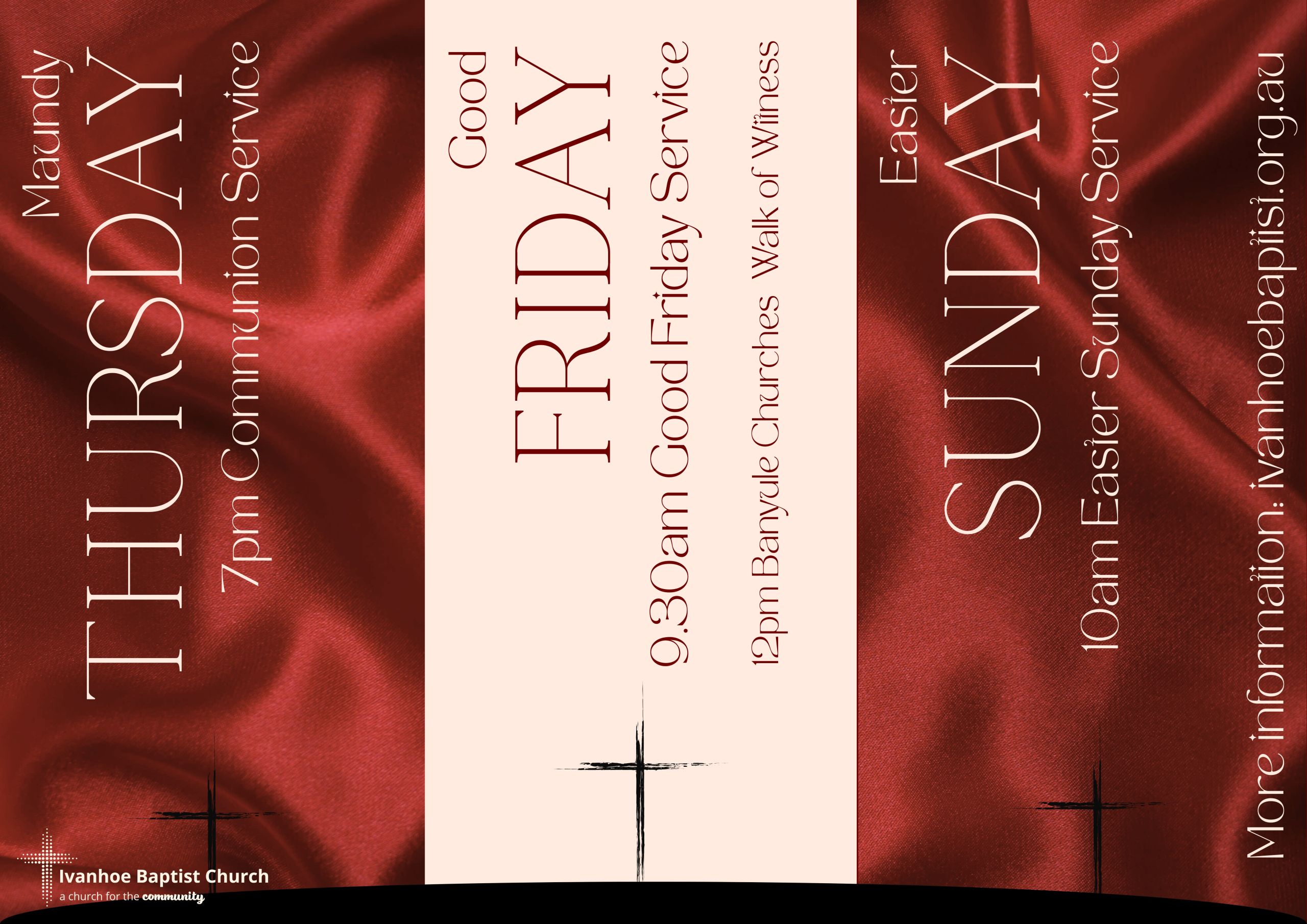 Join us on Thursday 2 April at 7:00 pm at Ivanhoe Baptist Church around the communion table as we remember Jesus and together remind ourselves of his deep and abiding love for his followers.