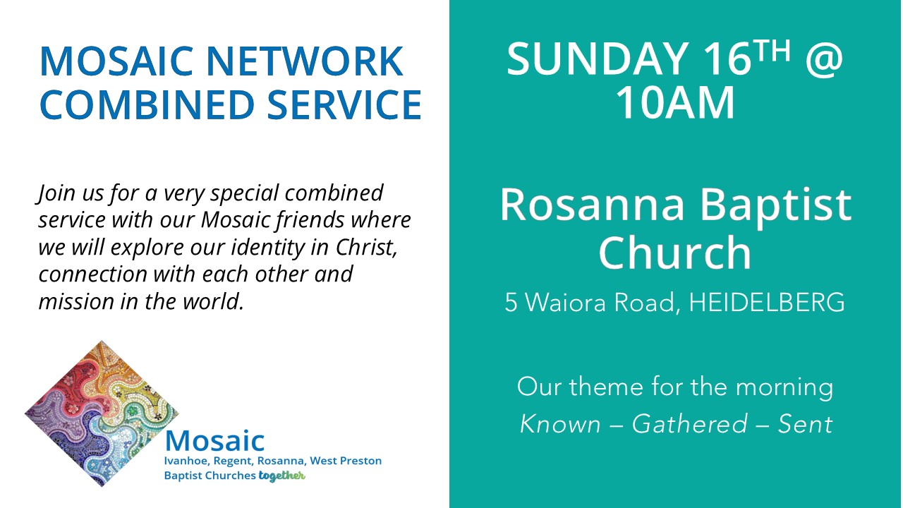 Venue: Rosanna Baptist Church. Please note that there is no service at Ivanhoe that morning.