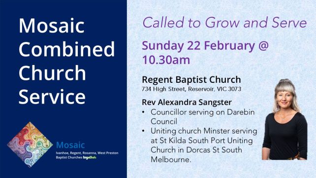 On Sunday 22nd February @ 10.30am we’re excited to welcome Rev Alexandra Sangster — Councillor on Darebin Council and Minister at St Kilda South Port Uniting Church — as she brings us a timely Lenten reflection on “The Call to Grow and Serve”.